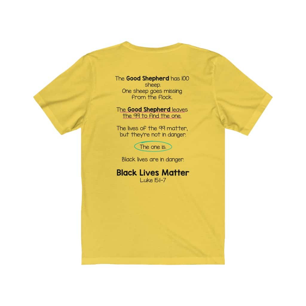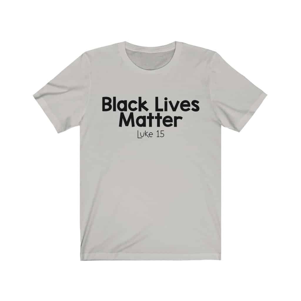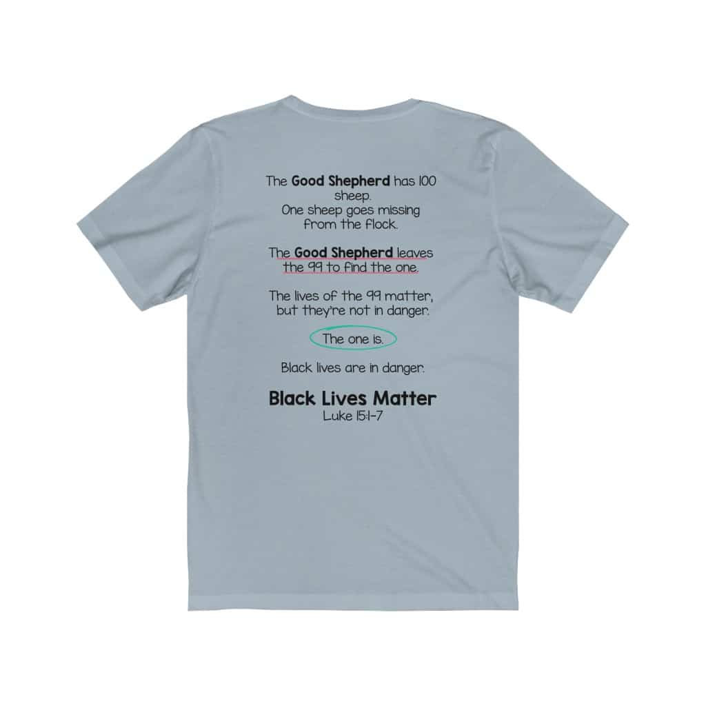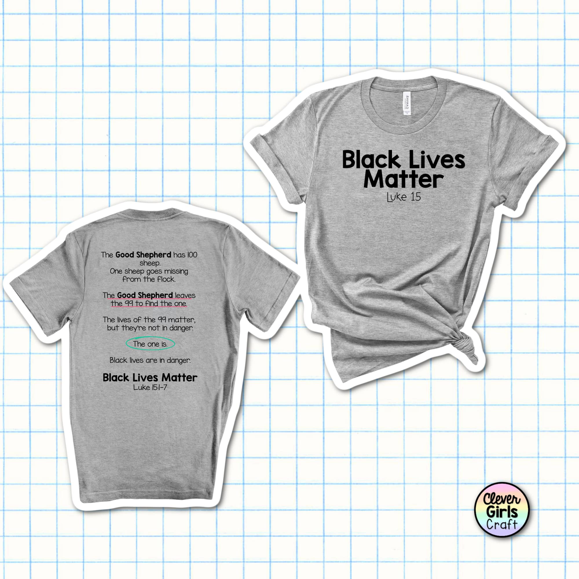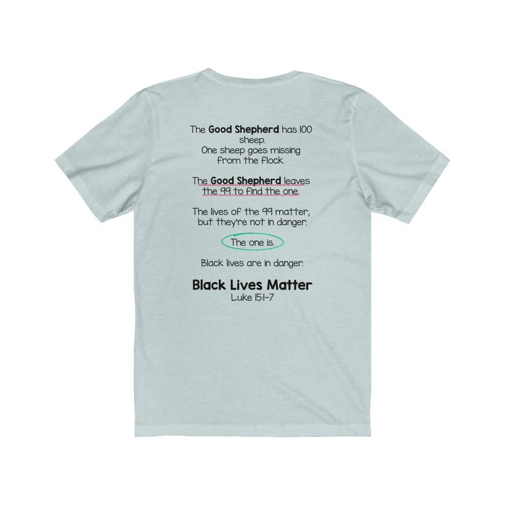 Black lives matter Bible verse T-shirt, with a summary of Luke 15 on the back.