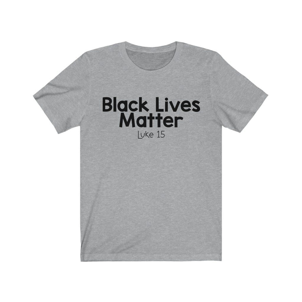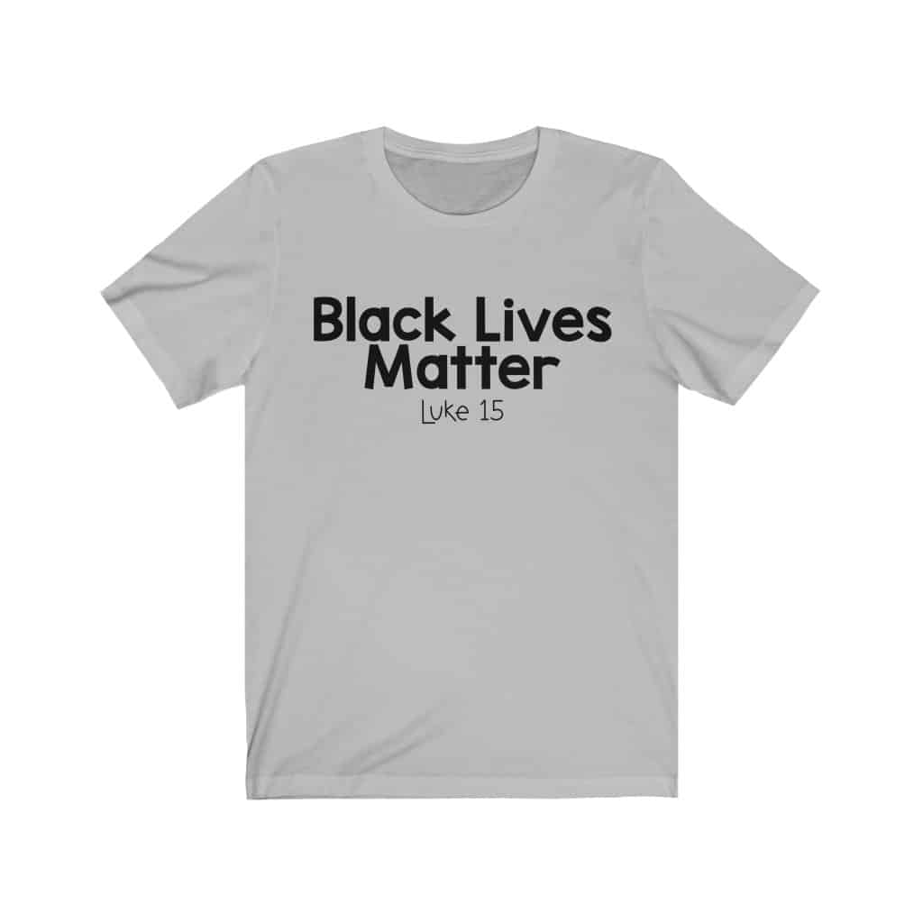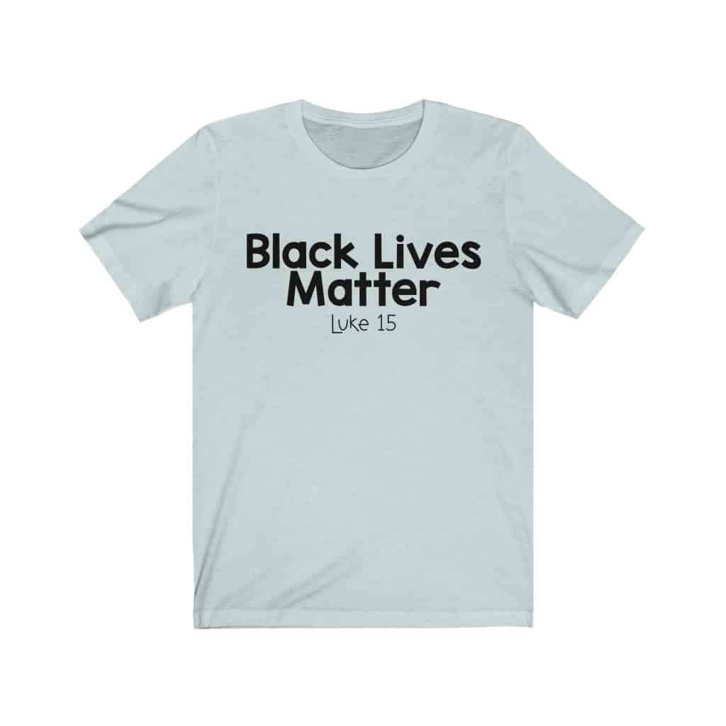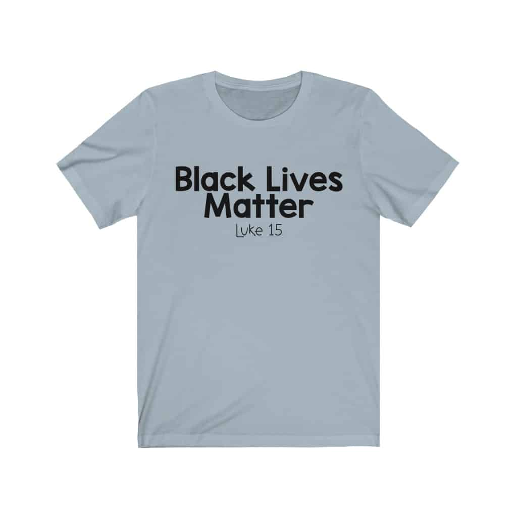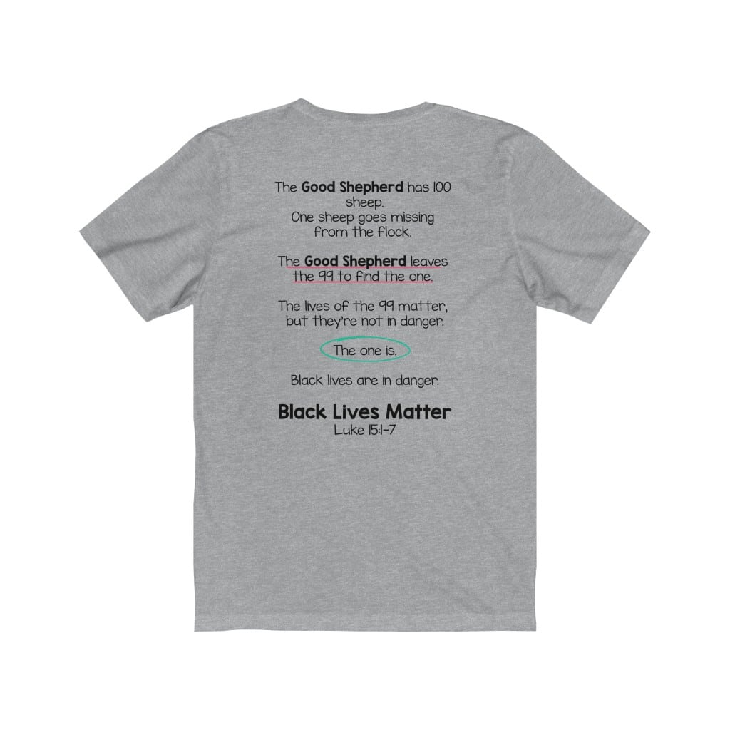 Black lives matter Bible verse T-shirt, with a summary of Luke 15 on the back.