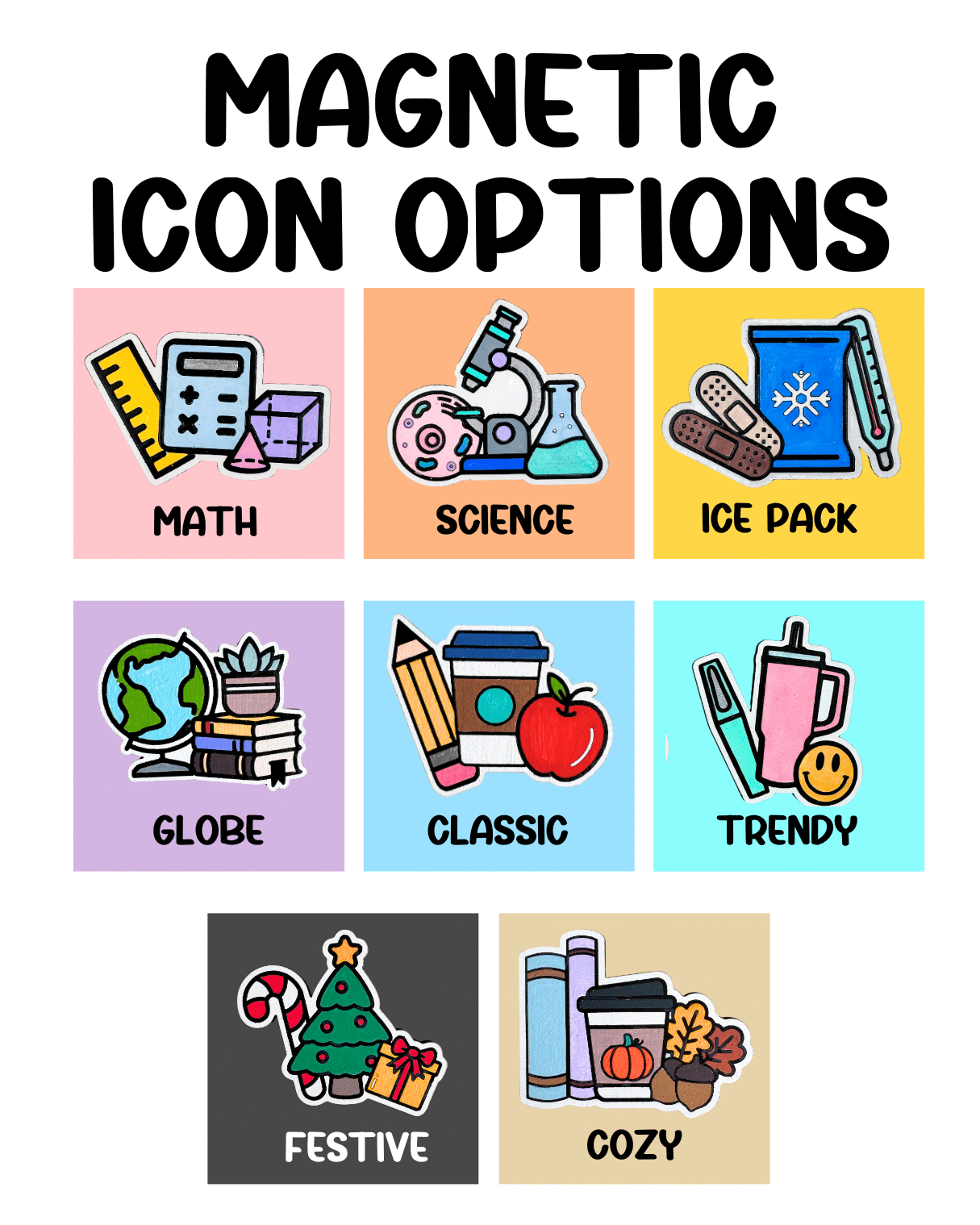 | Icon | Trendy, Classic, Science, Math, Globe, Ice Pack, Festive, Cozy |