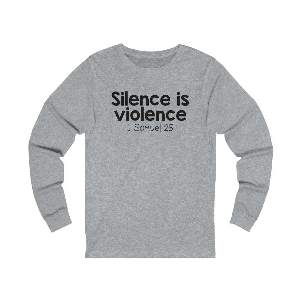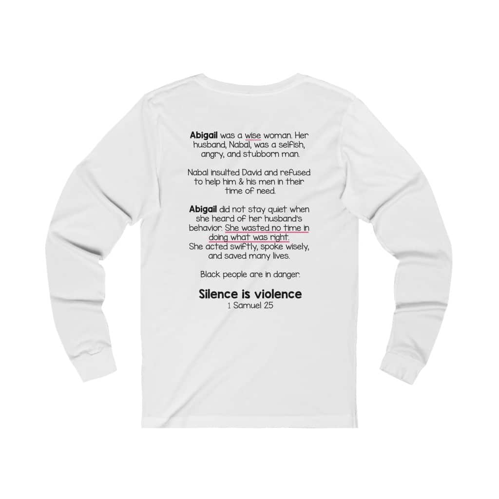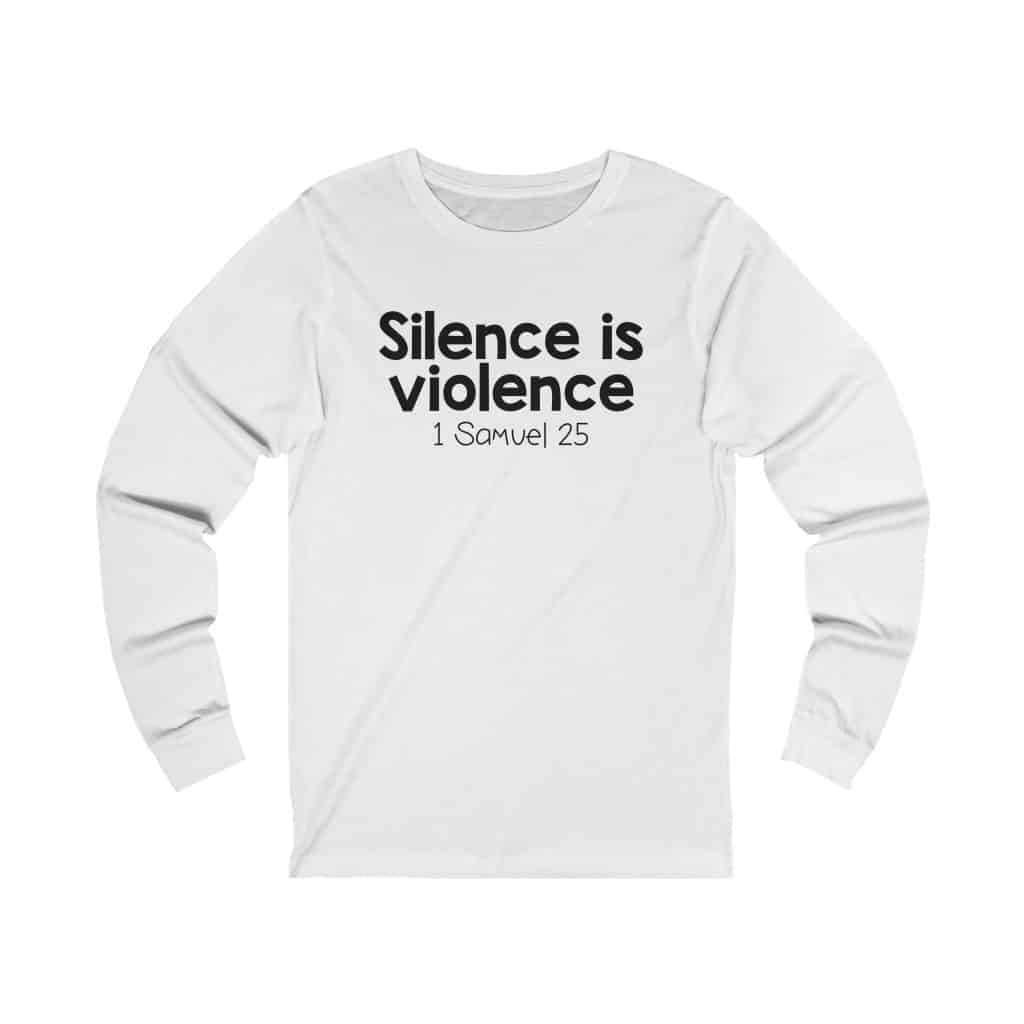 The front of this shirt says, “Silence is Violence 1 Samuel 25”