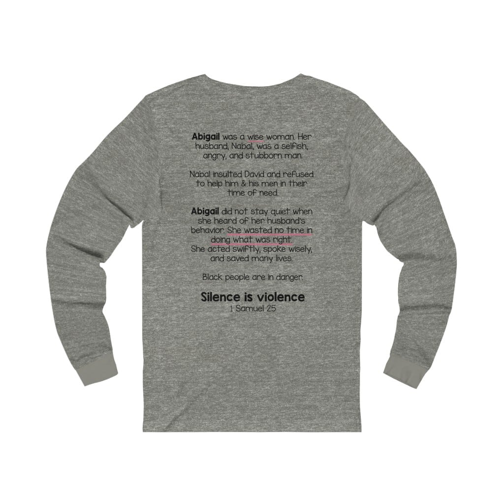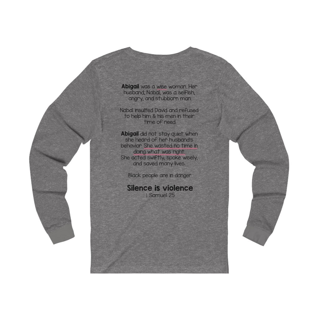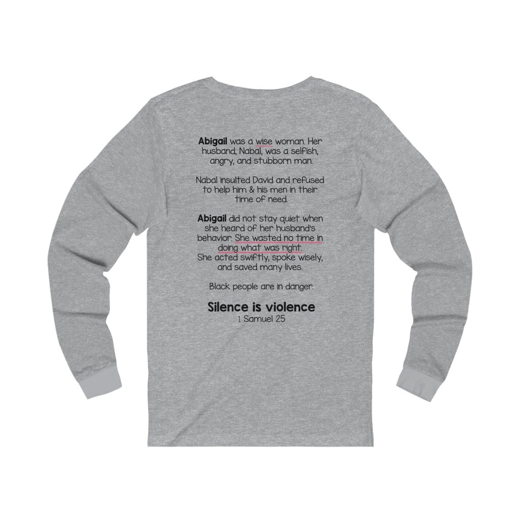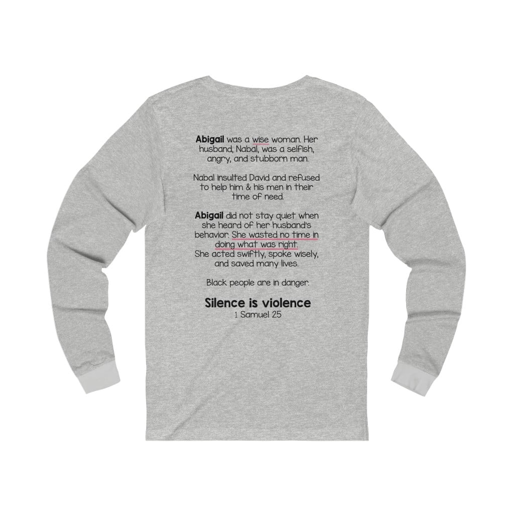 The front of this shirt says, “Silence is Violence 1 Samuel 25”