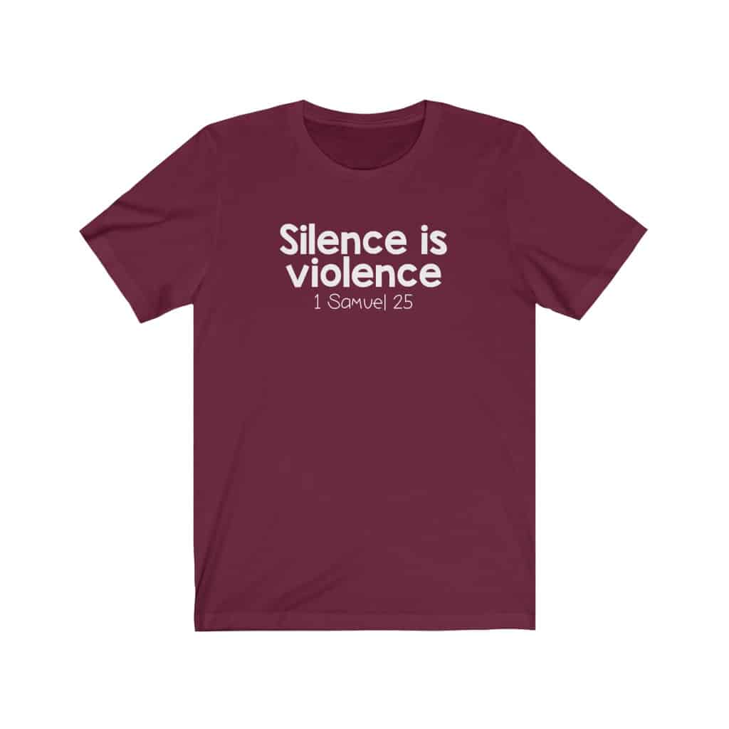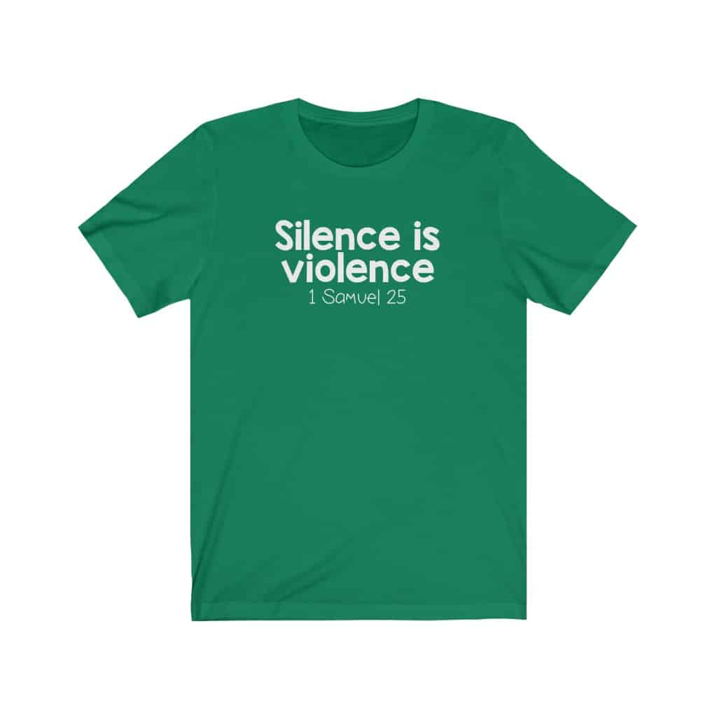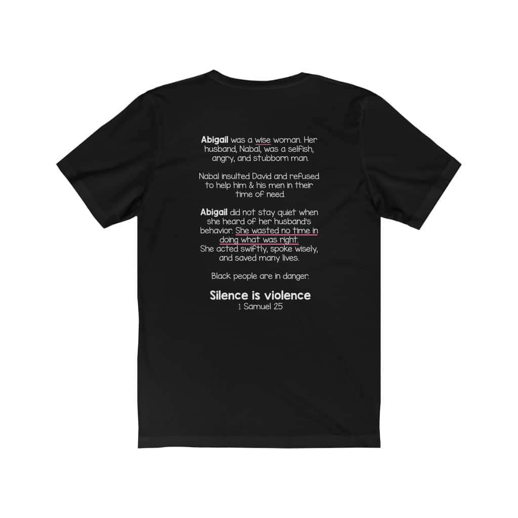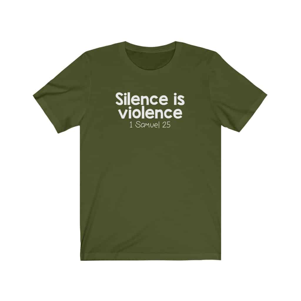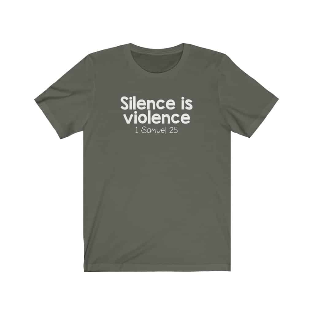 The front of this shirt says, “Silence is Violence 1 Samuel 25”