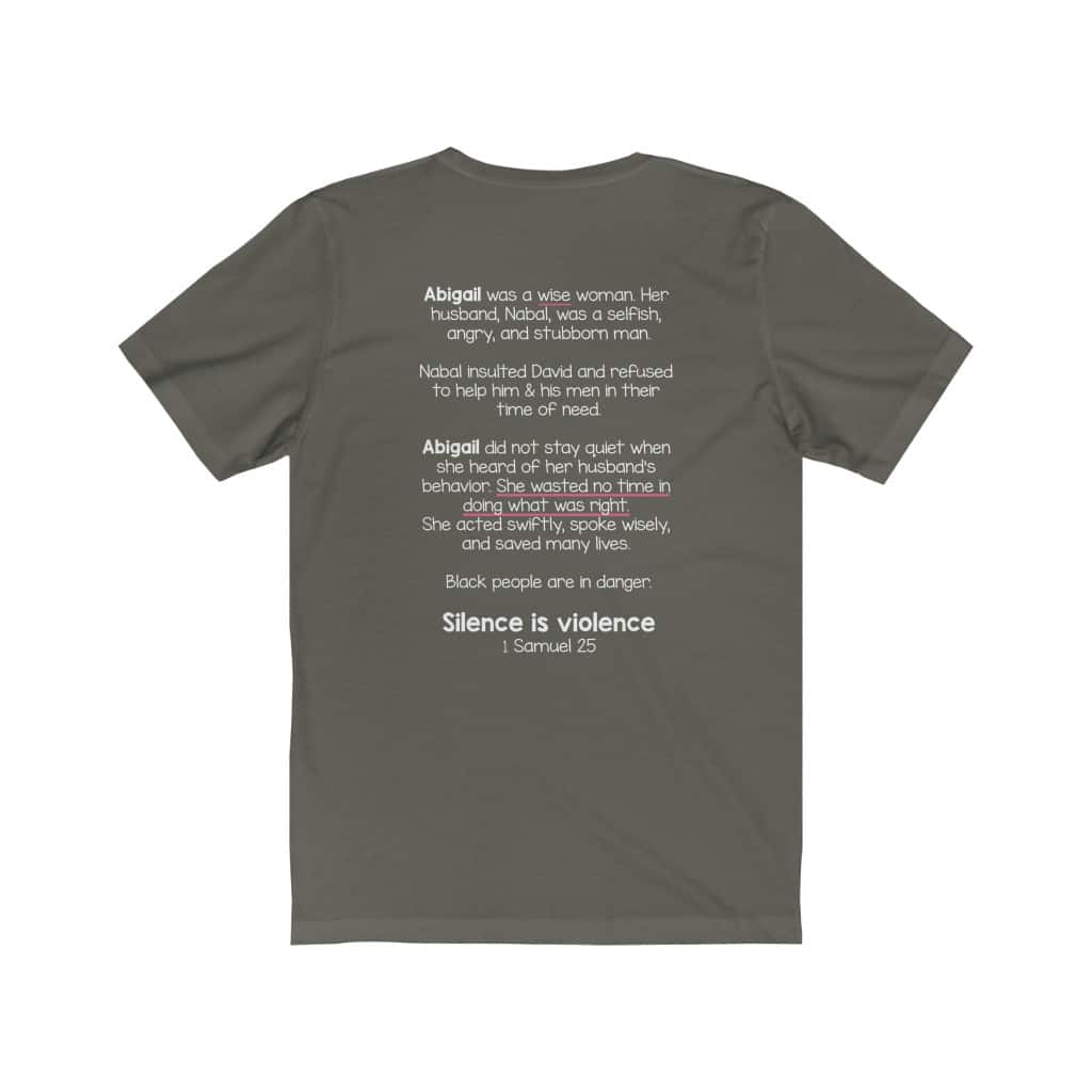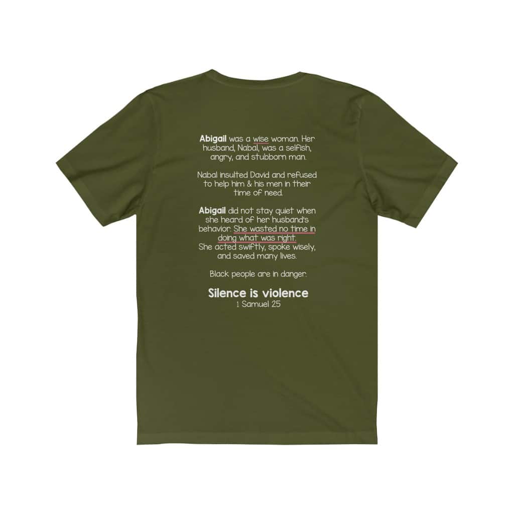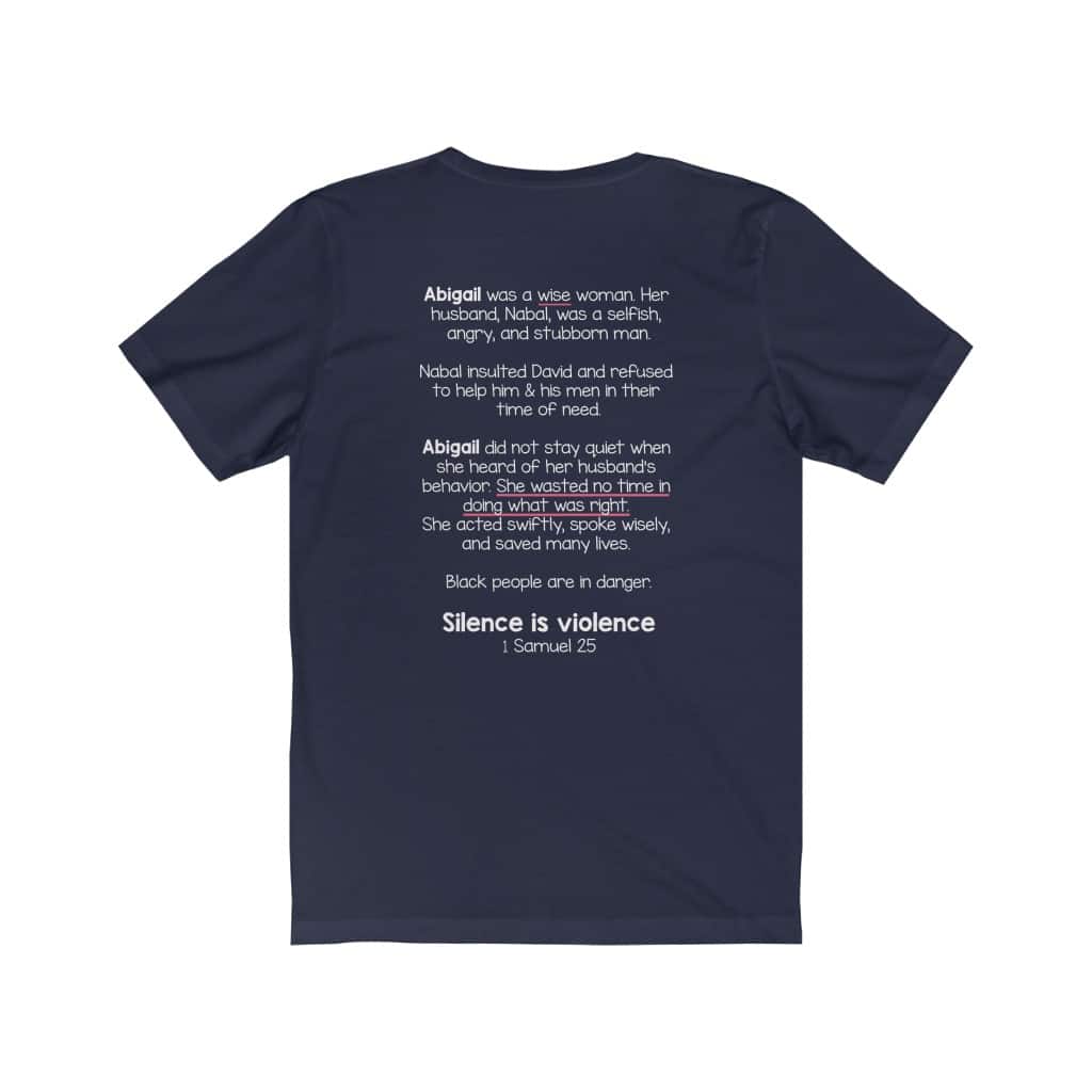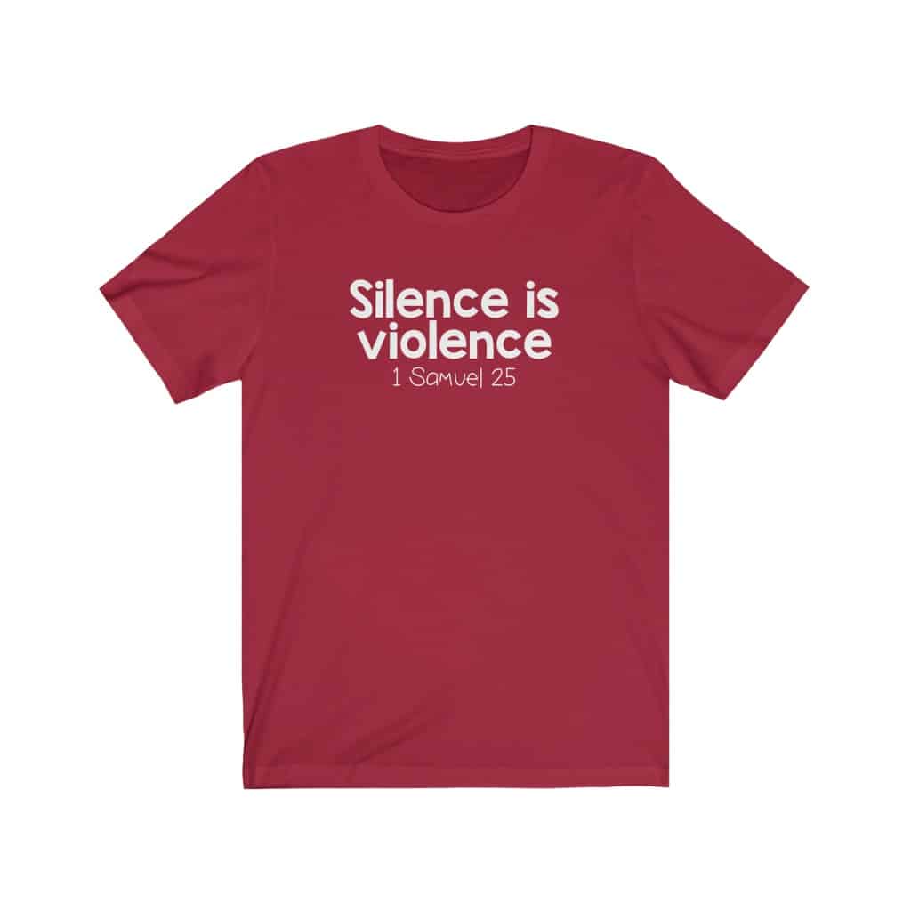 The front of this shirt says, “Silence is Violence 1 Samuel 25”