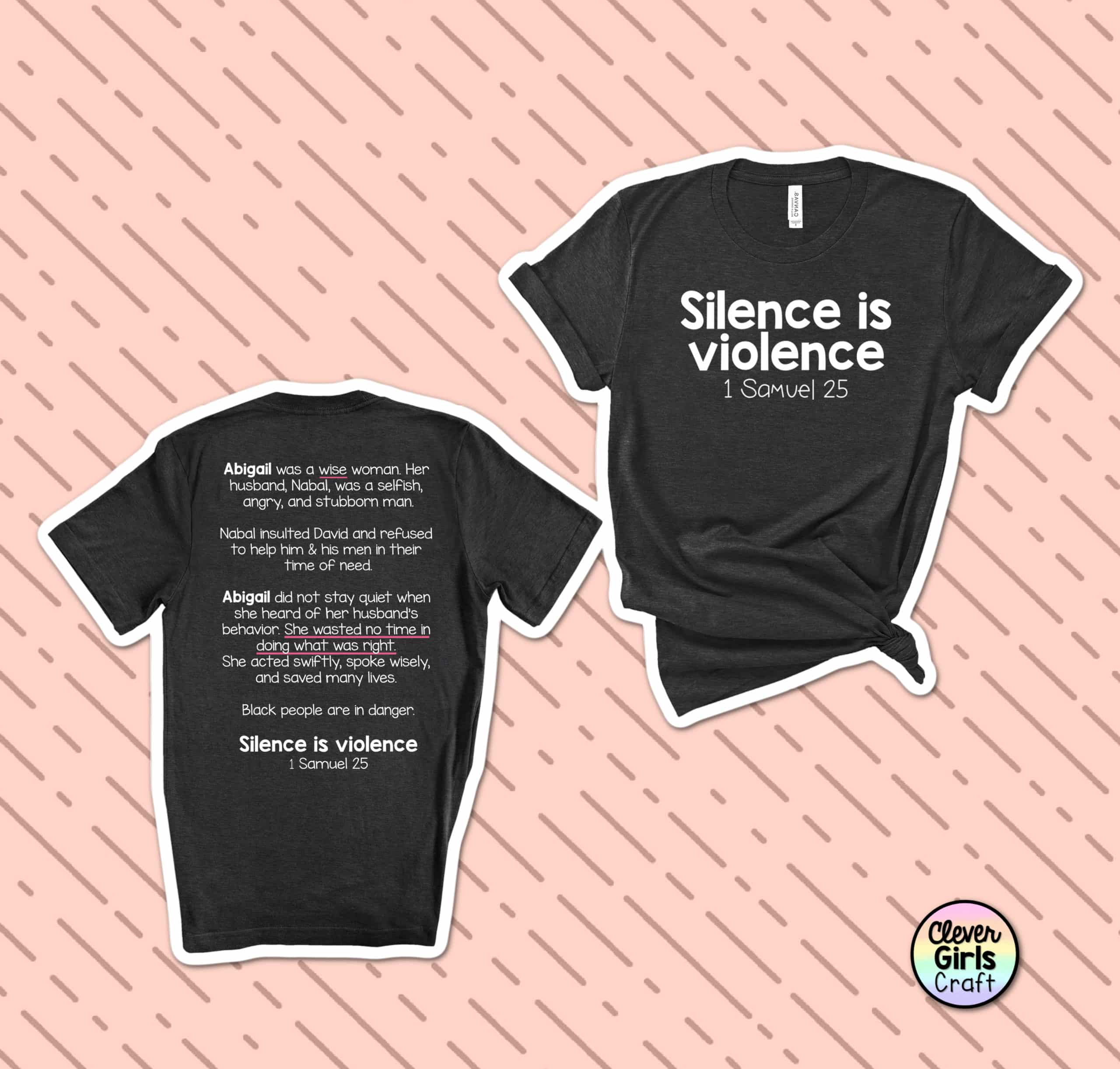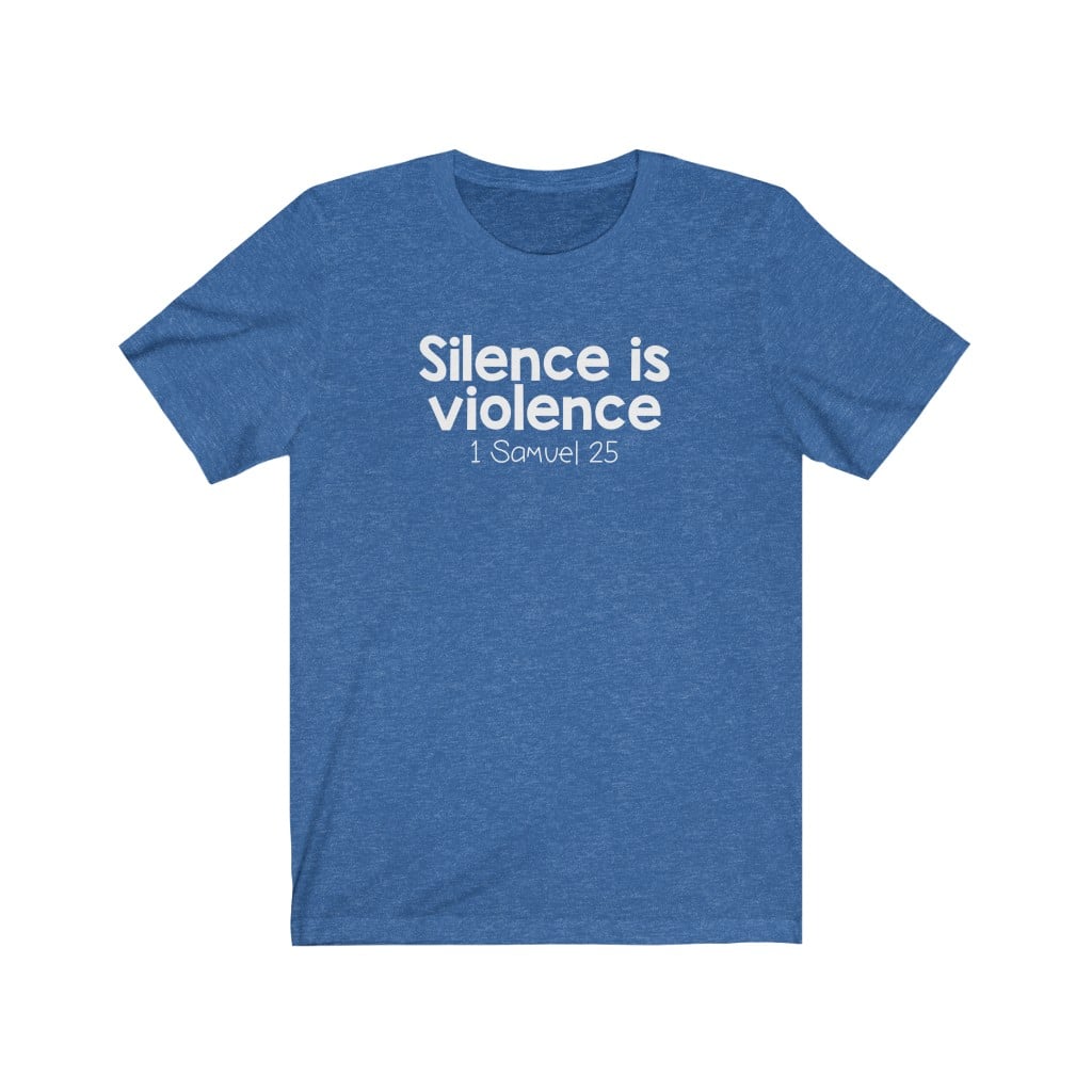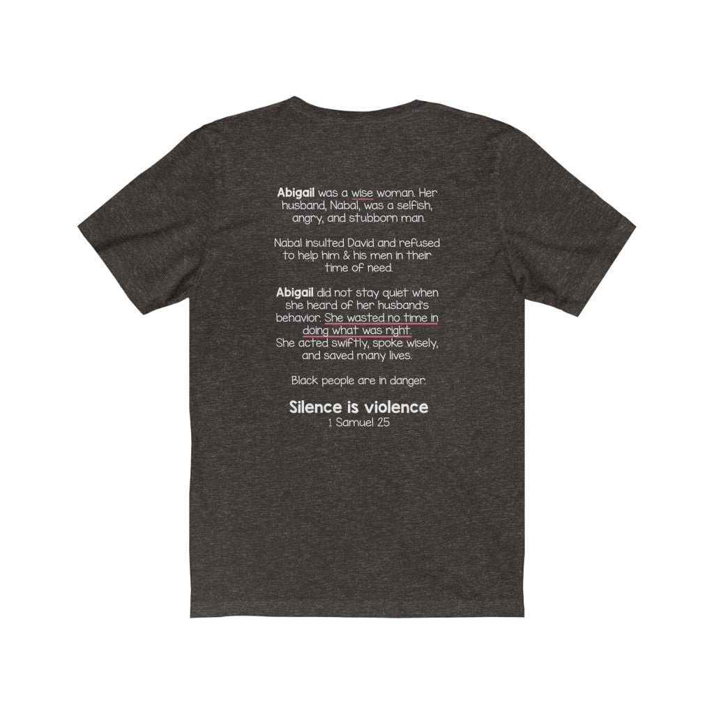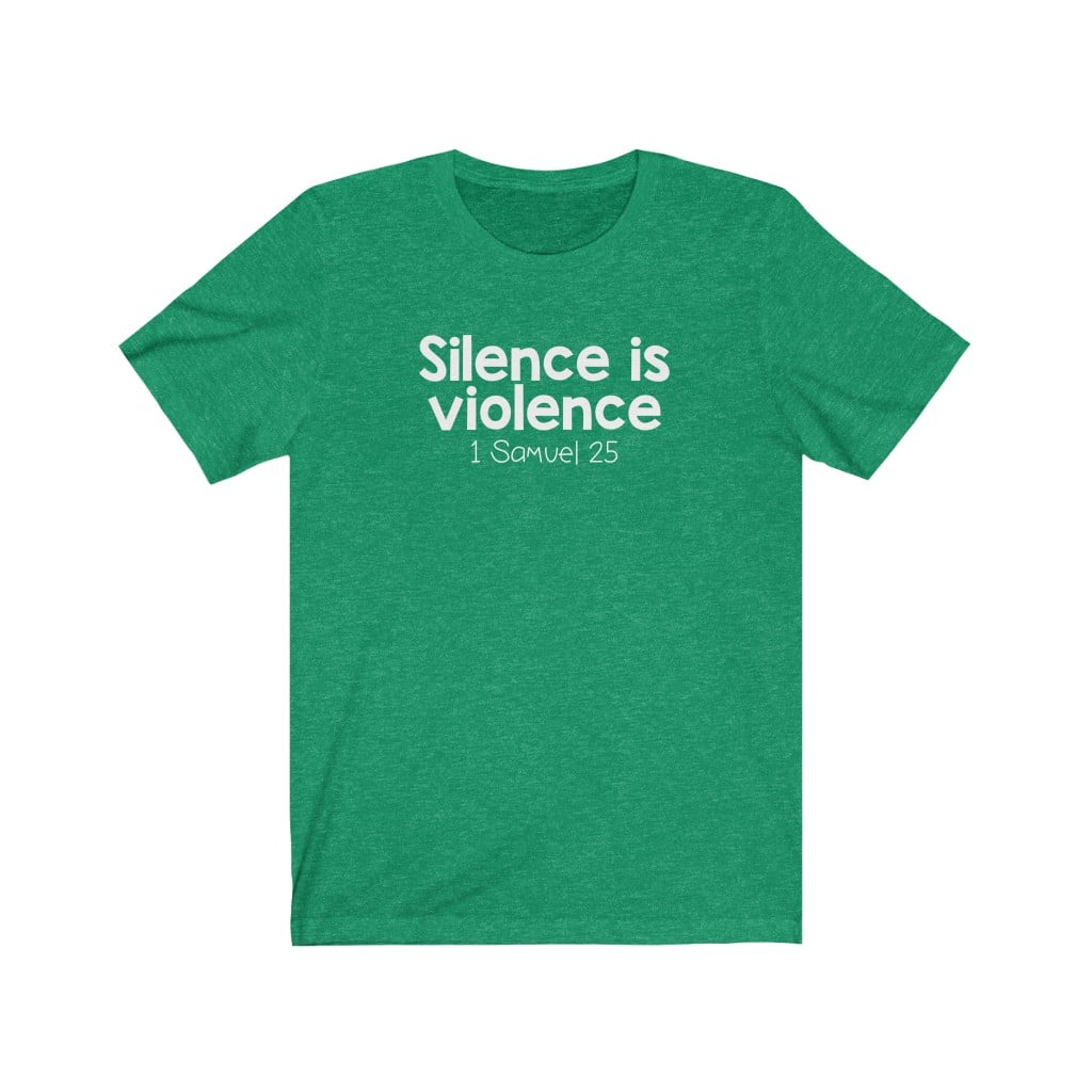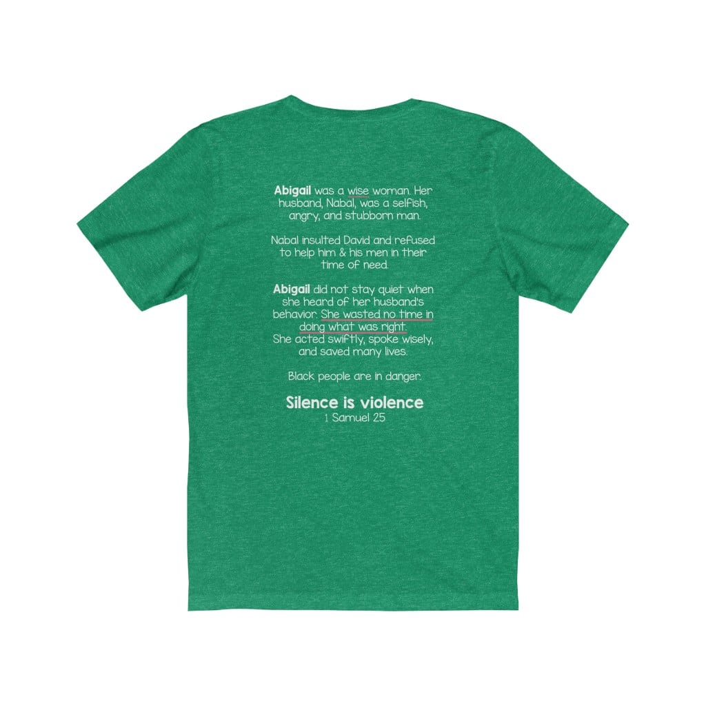 The front of this shirt says, “Silence is Violence 1 Samuel 25”